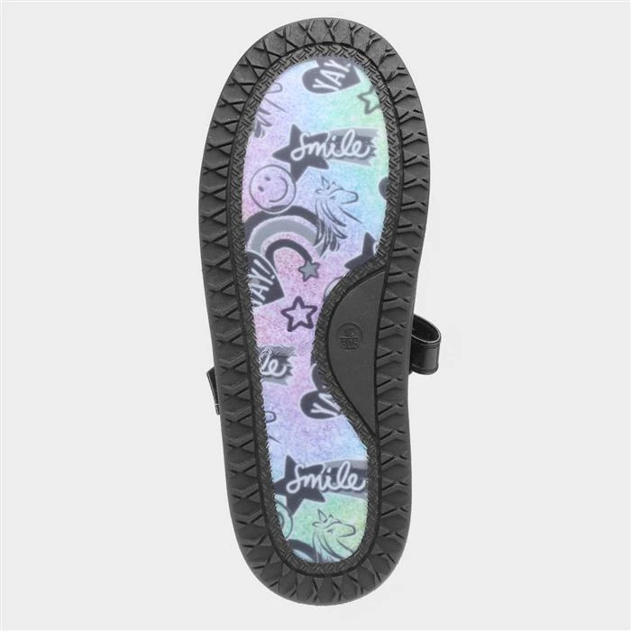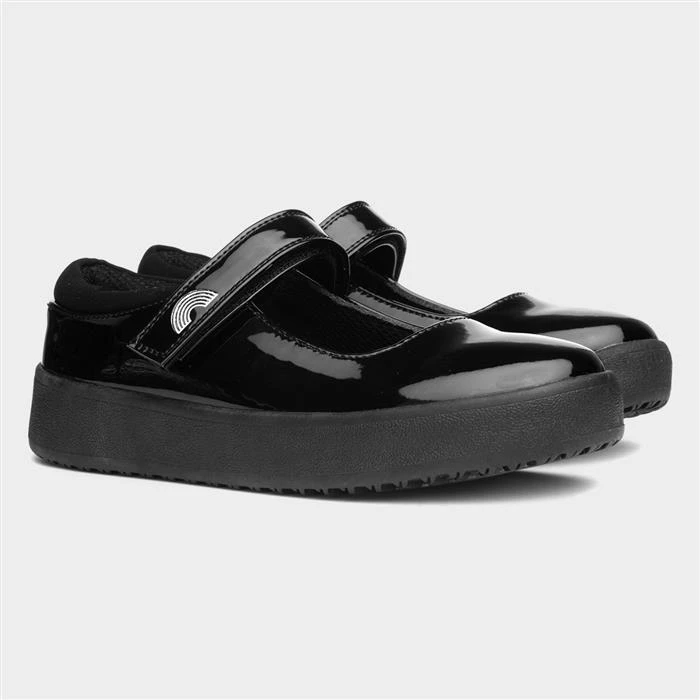 Get your kids ready for school with these kid’s school shoes designed by Buckle My Shoe. They feature a black, polished upper with a small rainbow design on their easy fasten strap for a quick and easy fit. Their colourful design on their outsole adds a little something extra to this school shoe, while their durability ensures a stable and secure fit. Their comfortable insoles allows a quality and stylish fit. This shoe could also be worn for smart occasions.