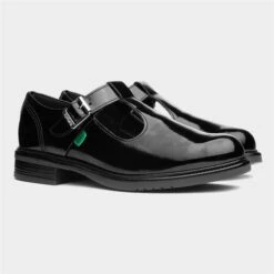 Designed by kickers, these kid’s school shoes feature a black leather upper with a buckle fastening for an easy and secure fit and a detailed stitching design. Their gripped outsole ensure stability and security, while their shiny finish adds style. These shoes offer both practicality and style, perfect for school!