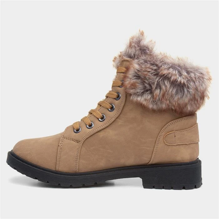 By Lilley, these gorgeous snug boots will keep your feet warm coming up to autumn/winter. Their cosy faux fur trim complements the tan upper and the lace up fastening. There is a chunky low sole adding comfort to your day with a buckle decoration on the side. Additionally, they feature a contrasting black grip sole for that finishing touch.