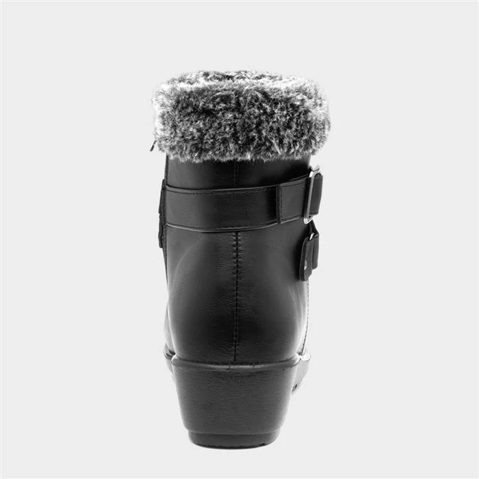 From Softlites, these women’s ankle boots embrace a black upper with faux fur collar and buckle strap detailing. They feature a zip up fastening for quick and easy fitting, while their padded insole and lightweight wedge outsole provides comfort to your feet.