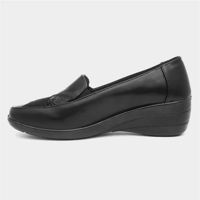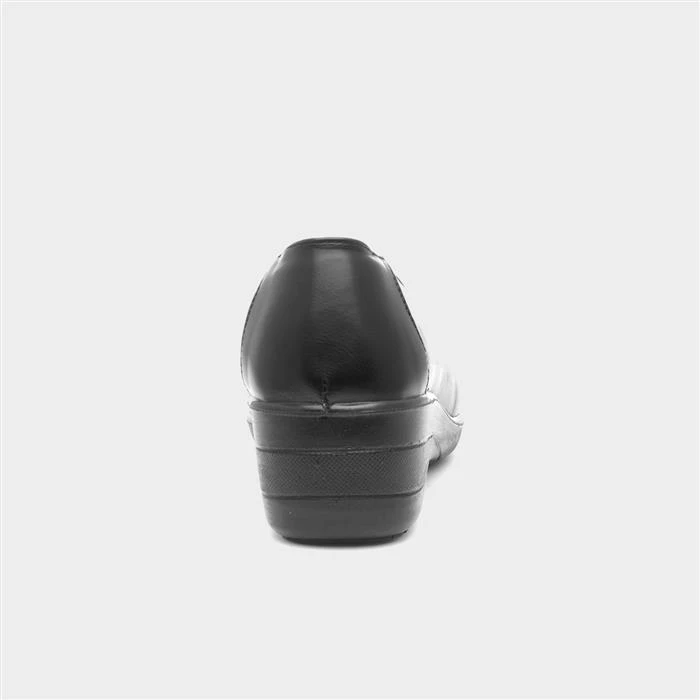 Update your shoedrobe this season with a brand new pair of everyday staple wedge shoes. These women’s shoes showcase a black upper along with fine stitch detailing and a textured front. Additionally, they feature a simple slip on design, making these ideal for everyday and work wear. Their thick wedge heel and grip sole provide both added comfort and support.