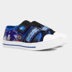 Sonic fans will love this Ringo canvas shoe. It features a blue upper with Sonic appearing on the side with rings behind him. They have an easy fasten strap and elasticated strap for a customised and comfortable fit, and their bump toe outsole is gripped for stability