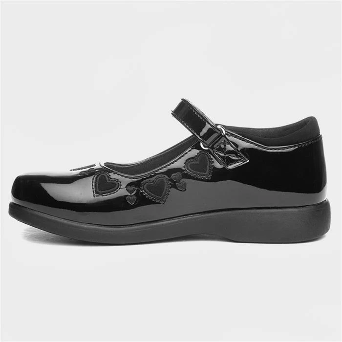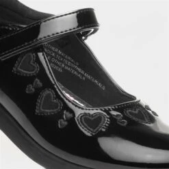 By Walkright, these girls’ school shoes embrace a black patent upper with stitched hearts. They feature an easy fasten bar strap for a secure fit, while their padded collar and insole ensures comfort beneath their feet.